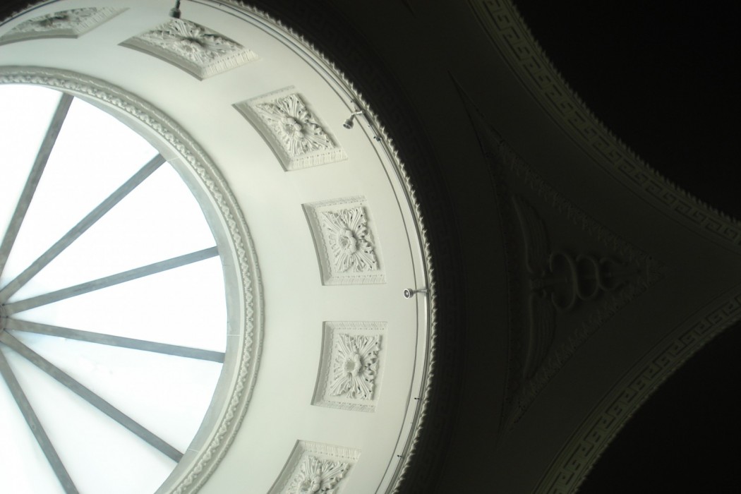 The exterior dimension stone masonry walls are composed of marble in the Neoclassical style, including Corinthian columns and pilasters, triangular pediments at the third-floor windows, rusticated stone at the ground floor, stone dentils at the cornice, and a water table at the third floor. The wood double-hung windows are glazed with true divided lites comprised of single-pane glass.