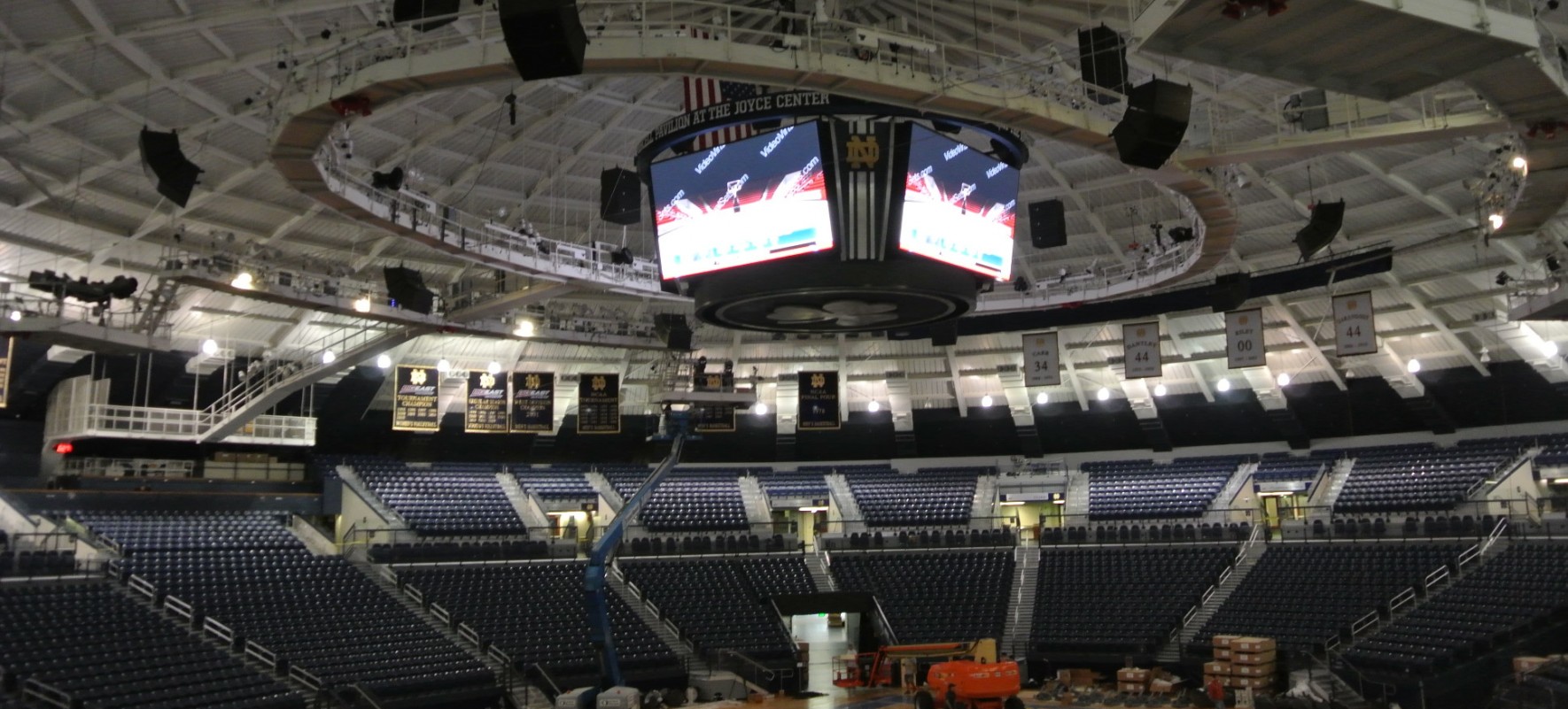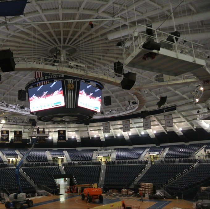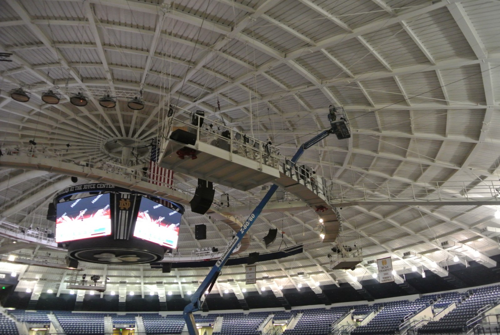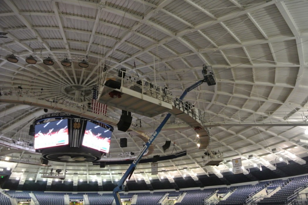 The South Dome of the Joyce Athletic and Convocation Center, originally opened in 1968 and substantially renovated in 2008, is home to the newly named Purcell Pavilion, which hosts the University of Notre Dame men's and women's basketball and volleyball programs. A ellipse-shaped catwalk ring encircles the center of the arena, stretching approximately 103 feet in the east-west direction and approximately 65 feet in the north-south direction, where it abuts the access walks for spot platforms. The basic structure is composed of steel-edge channels suspended by threaded rod hangers that extend to the domed roof.