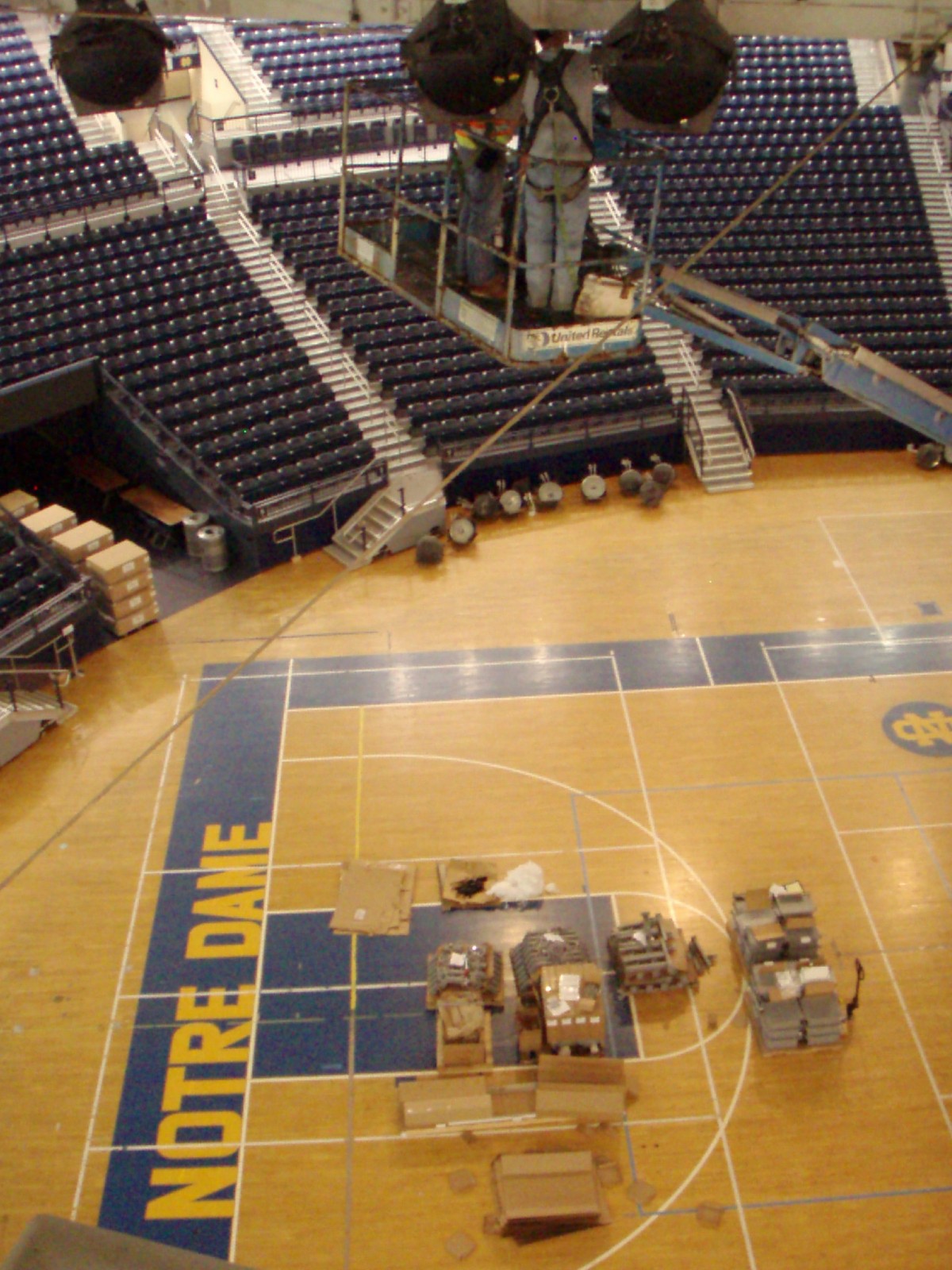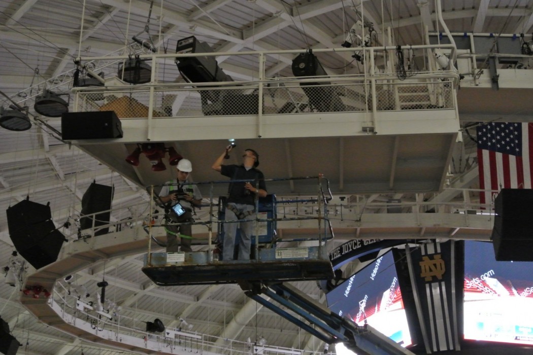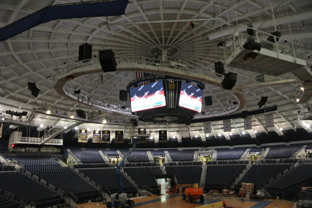The South Dome of the Joyce Athletic and Convocation Center, originally opened in 1968 and substantially renovated in 2008, is home to the newly named Purcell Pavilion, which hosts the University of Notre Dame men's and women's basketball and volleyball programs. A ellipse-shaped catwalk ring encircles the center of the arena, stretching approximately 103 feet in the east-west direction and approximately 65 feet in the north-south direction, where it abuts the access walks for spot platforms. The basic structure is composed of steel-edge channels suspended by threaded rod hangers that extend to the domed roof.