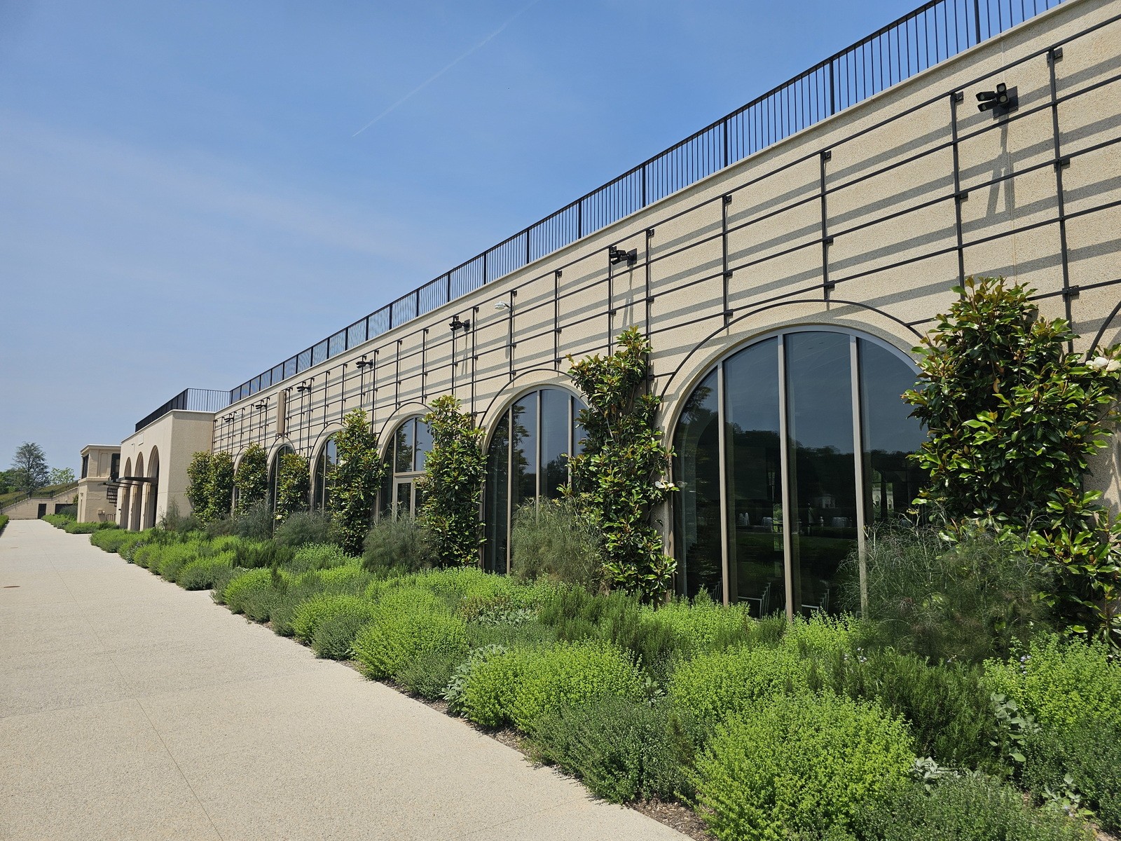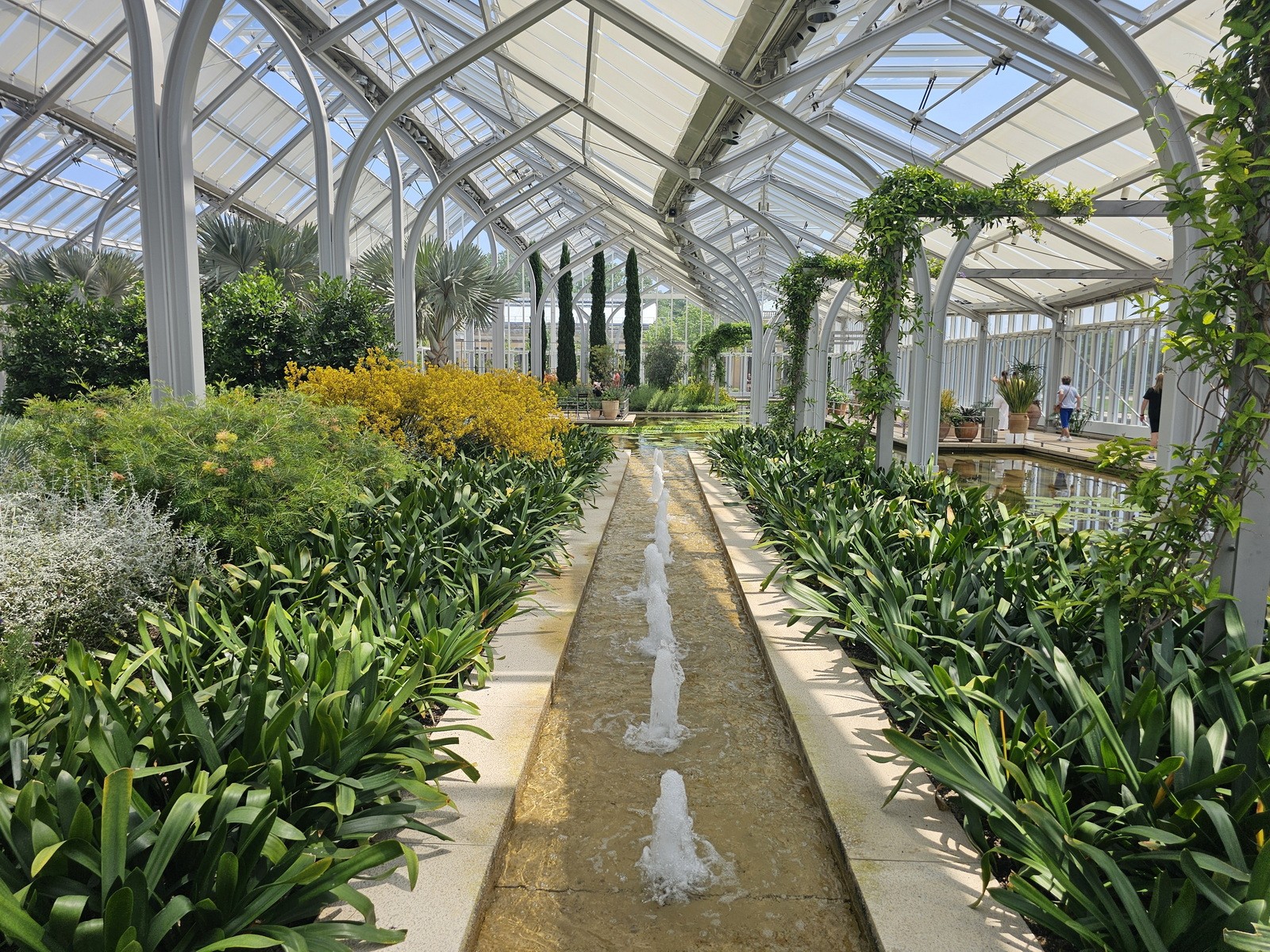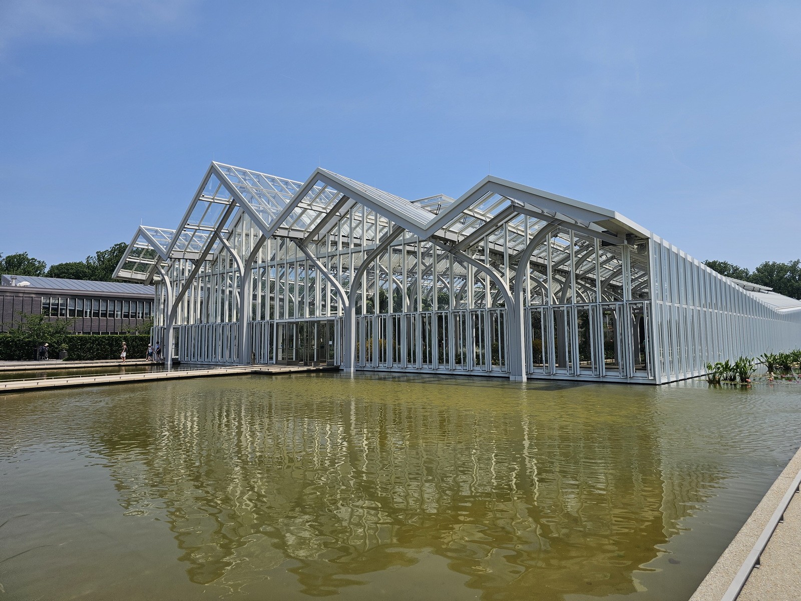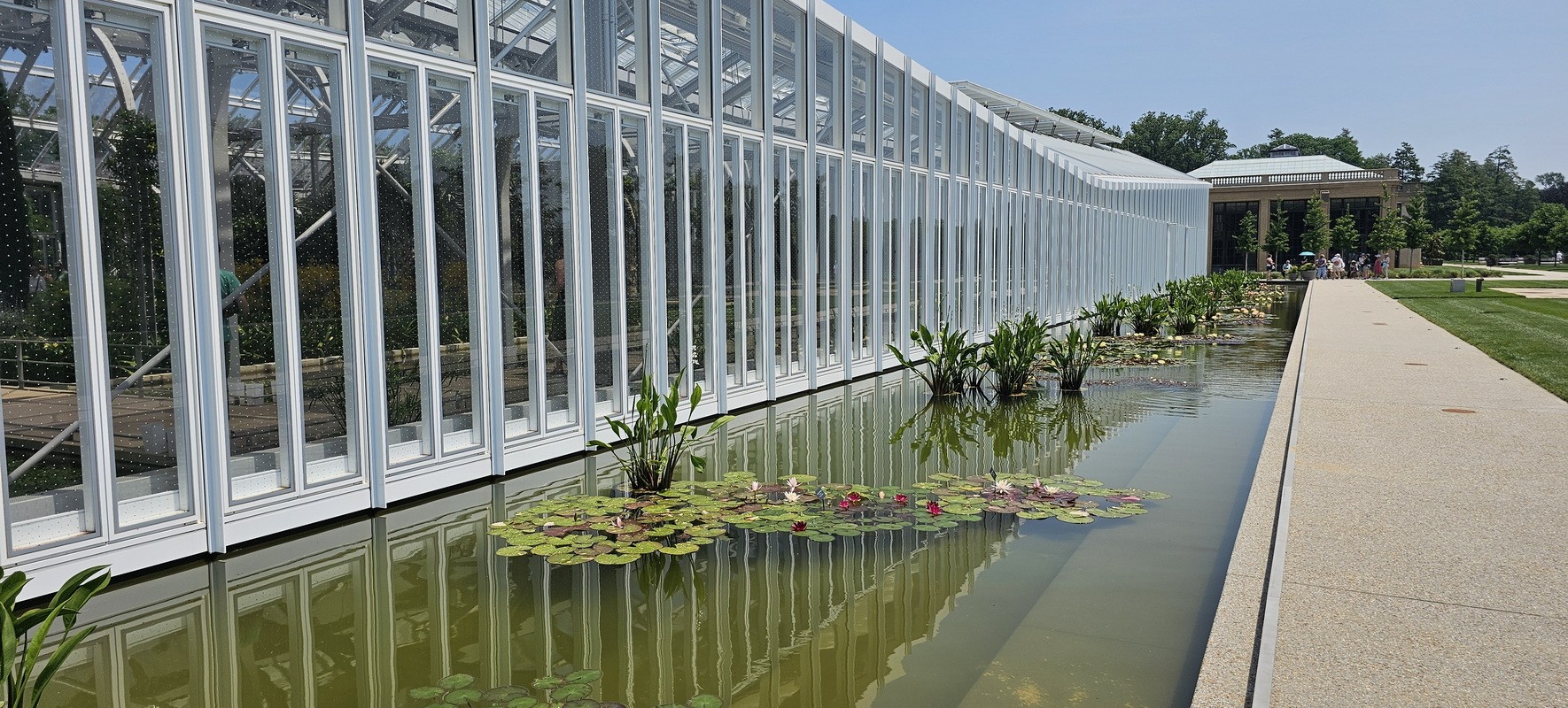 The West Conservatory is a new glass-enclosed building consisting of 32,000 square feet of underground basement and a 32,000 square foot elevated slab. The gardens, which are constructed above occupied space, appear to float on water, allowing the plants to thrive within a controlled environment. The water feature also includes movable planters.
