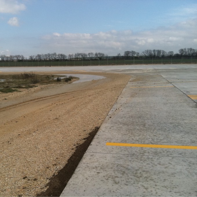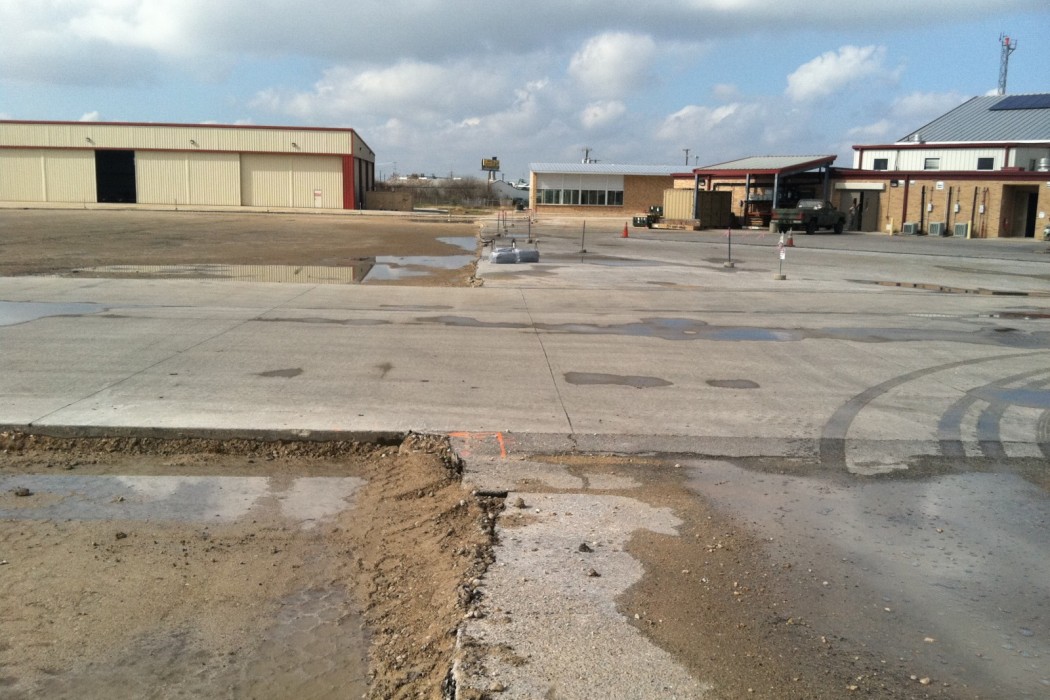 Prior to WJE's involvement, the Martindale Texas Army National Guard airfield apron and taxiway accommodated parking for ten UH-60 helicopters on the south side of the apron and ten abandoned helicopter parking areas on the north side. The Adjutant General's Department of Texas retained WJE to perform a preliminary investigation of the proposed site for the improvements to the north side of the apron and to design replacement paving for the north side to provide parking for six additional UH-60 helicopters.