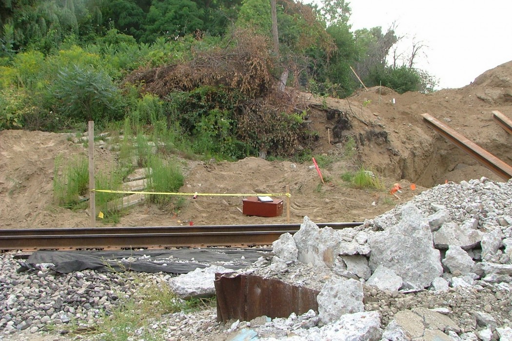 WJE developed a monitoring program to ensure that the water main's vibration and settlement during construction did not exceed the limits specified by the DWSD. The vibration monitoring utilized a remotely operated seismograph to minimize the field labor costs, the data from which was downloaded twice a day. Settlement monitoring was also performed by installing telltales and measuring their elevations three times per week with surveying equipment. WJE's monitoring program confirmed that excessive settlement or vibration did not occur during bridge demolition and pile driving operations of the new construction.