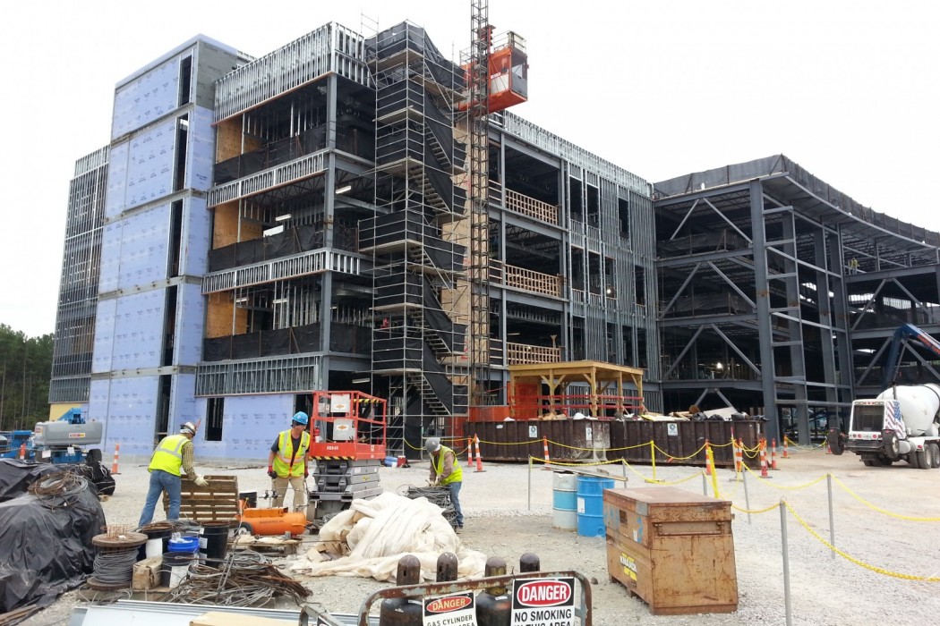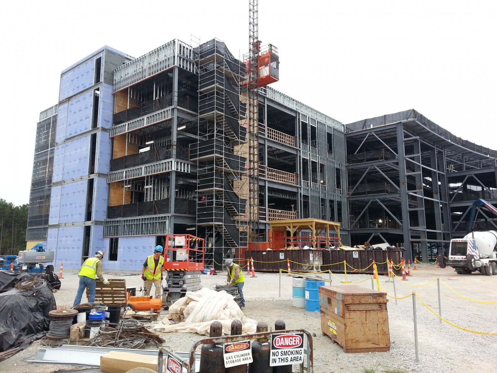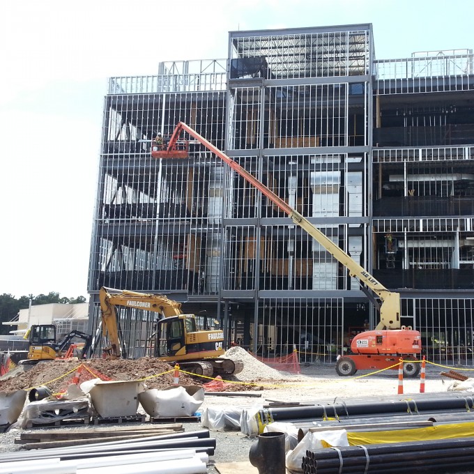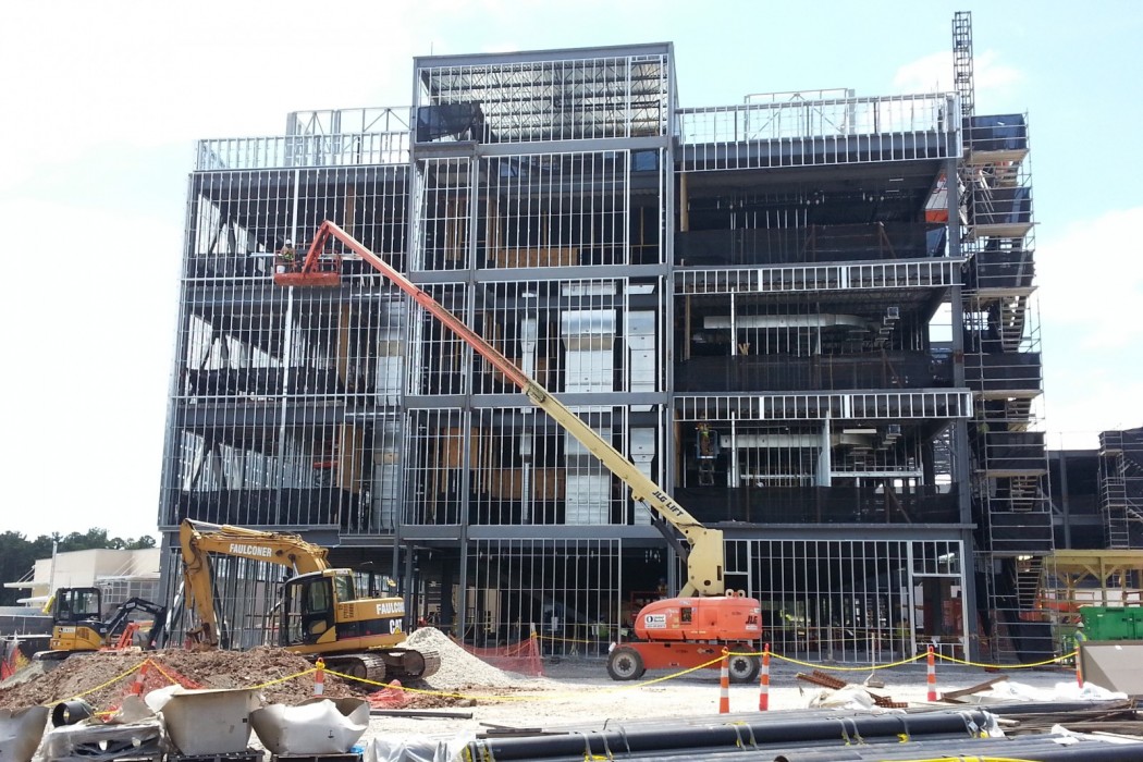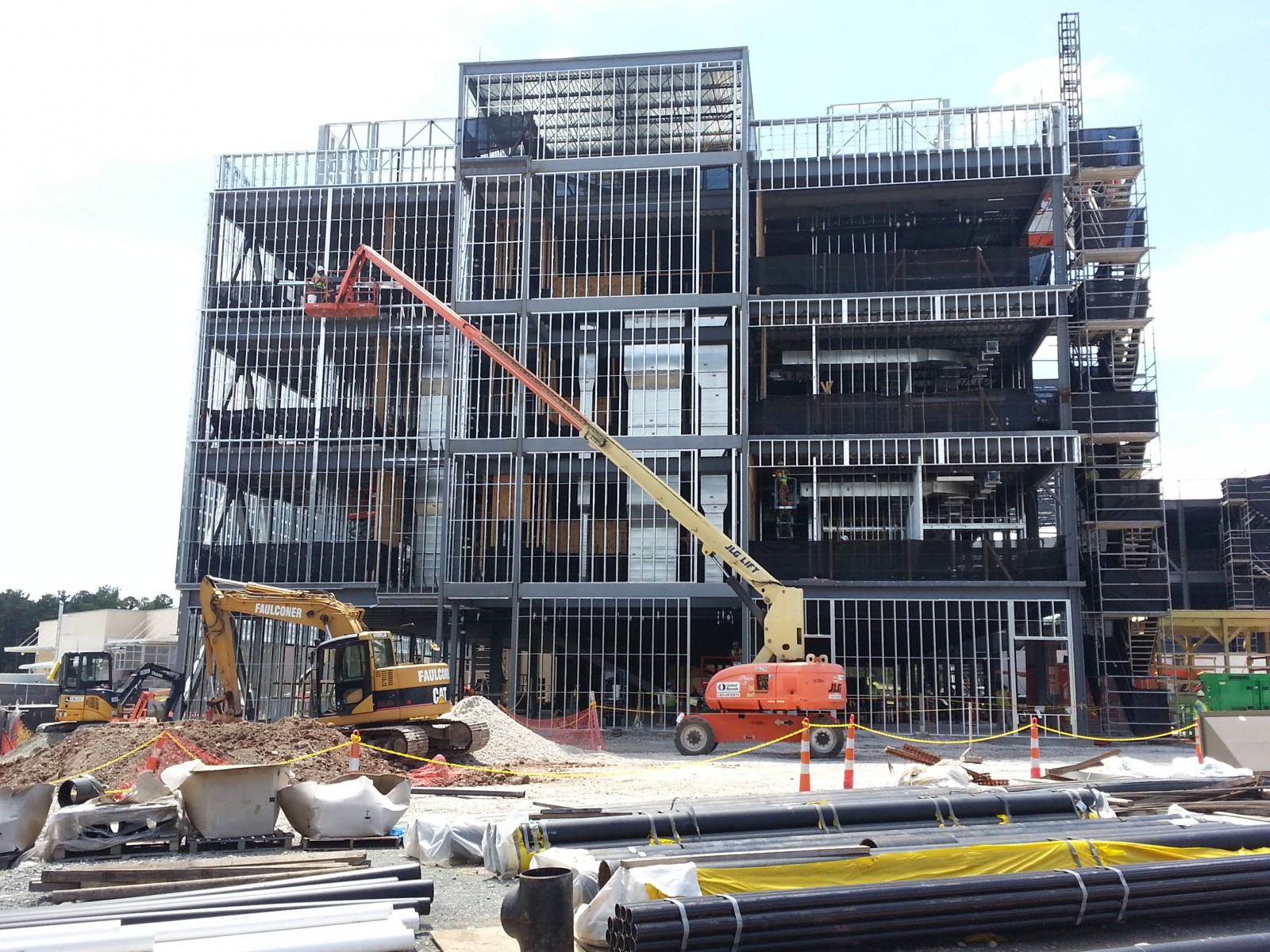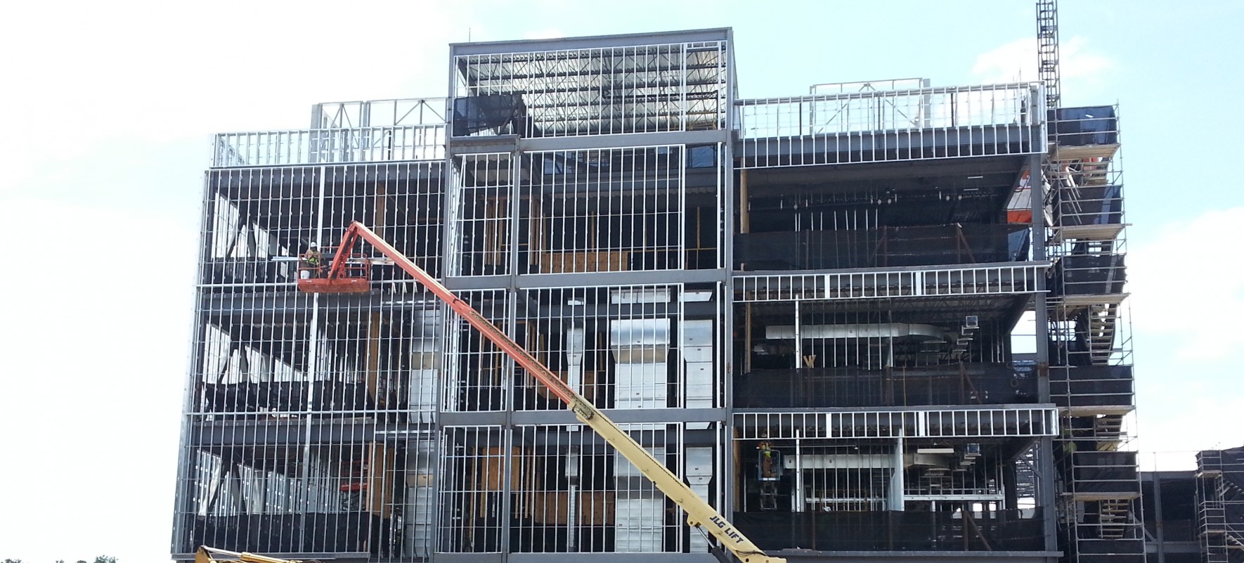 The primary facade components of the building envelope under construction included glazed aluminum punched windows and curtain wall—with sunshades at some locations—insulated metal panels, and areas of clay brick masonry in a cavity wall configuration.