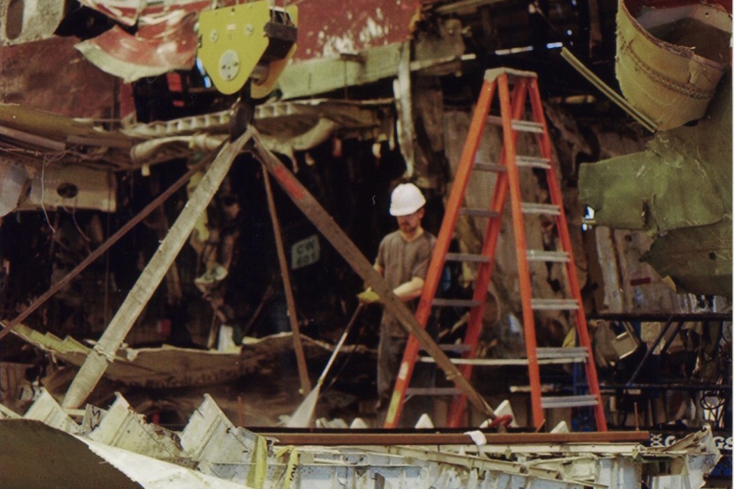 WJE's first objective for the reconstruction was to design, fabricate, deliver, and erect a skeletal framework capable of supporting the recovered pieces of the plane's fuselage and related elements. The framework design had to satisfy several criteria: minimize alterations to recovered pieces of the aircraft; minimize viewing obstructions; accommodate substantial dimensional distortions; and allow installation of recovered cabin components. Then, a team of two WJE engineers and two technicians rigged, positioned, and attached the pieces of the damaged aircraft on the truss to reconstruct the airliner to its approximate original geometry. Finally, the WJE team designed a system to permit the reconstructed segment to be moved.