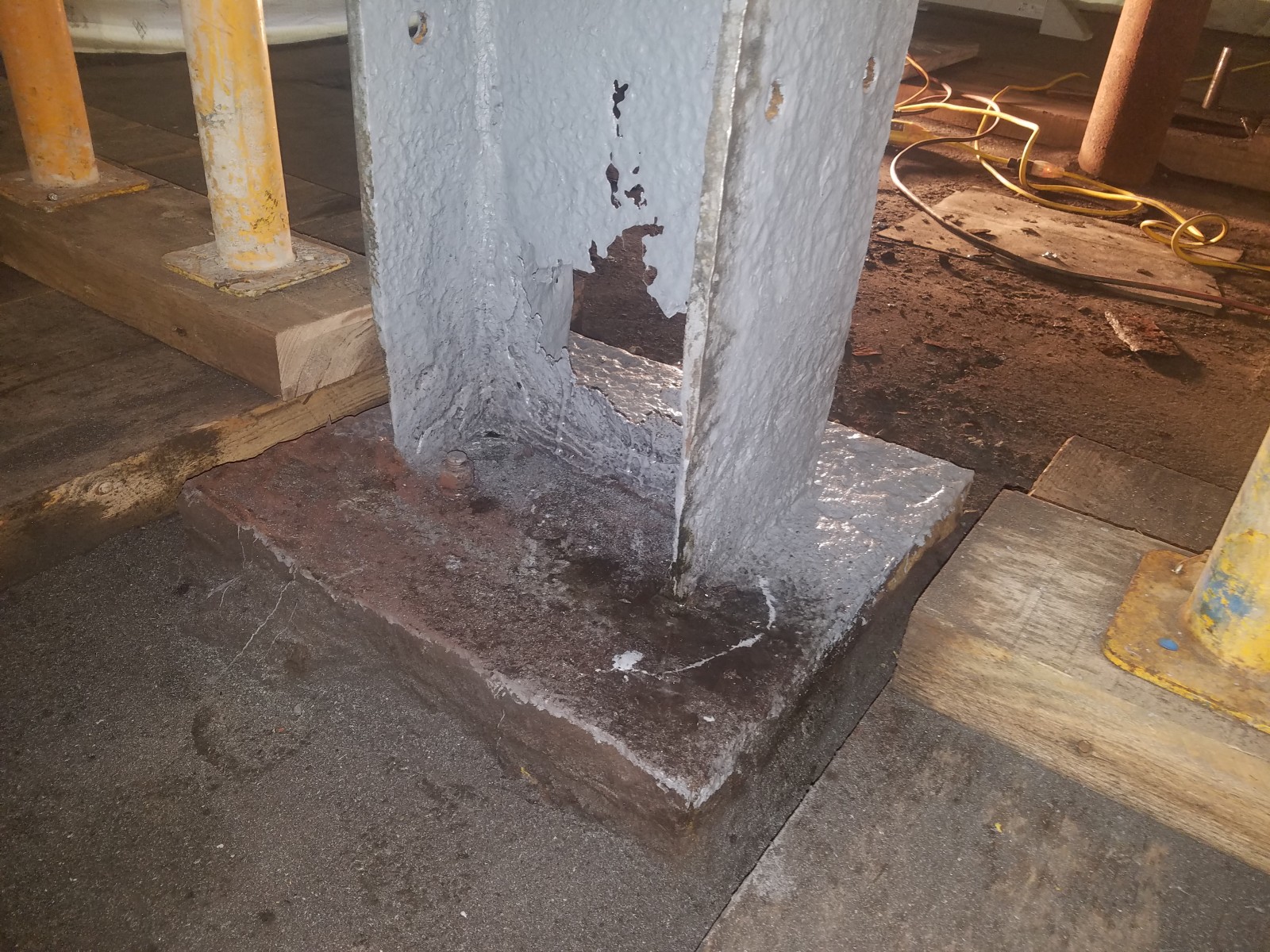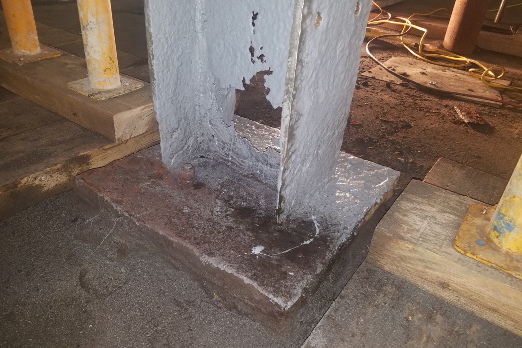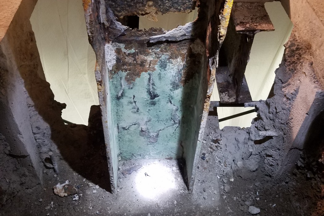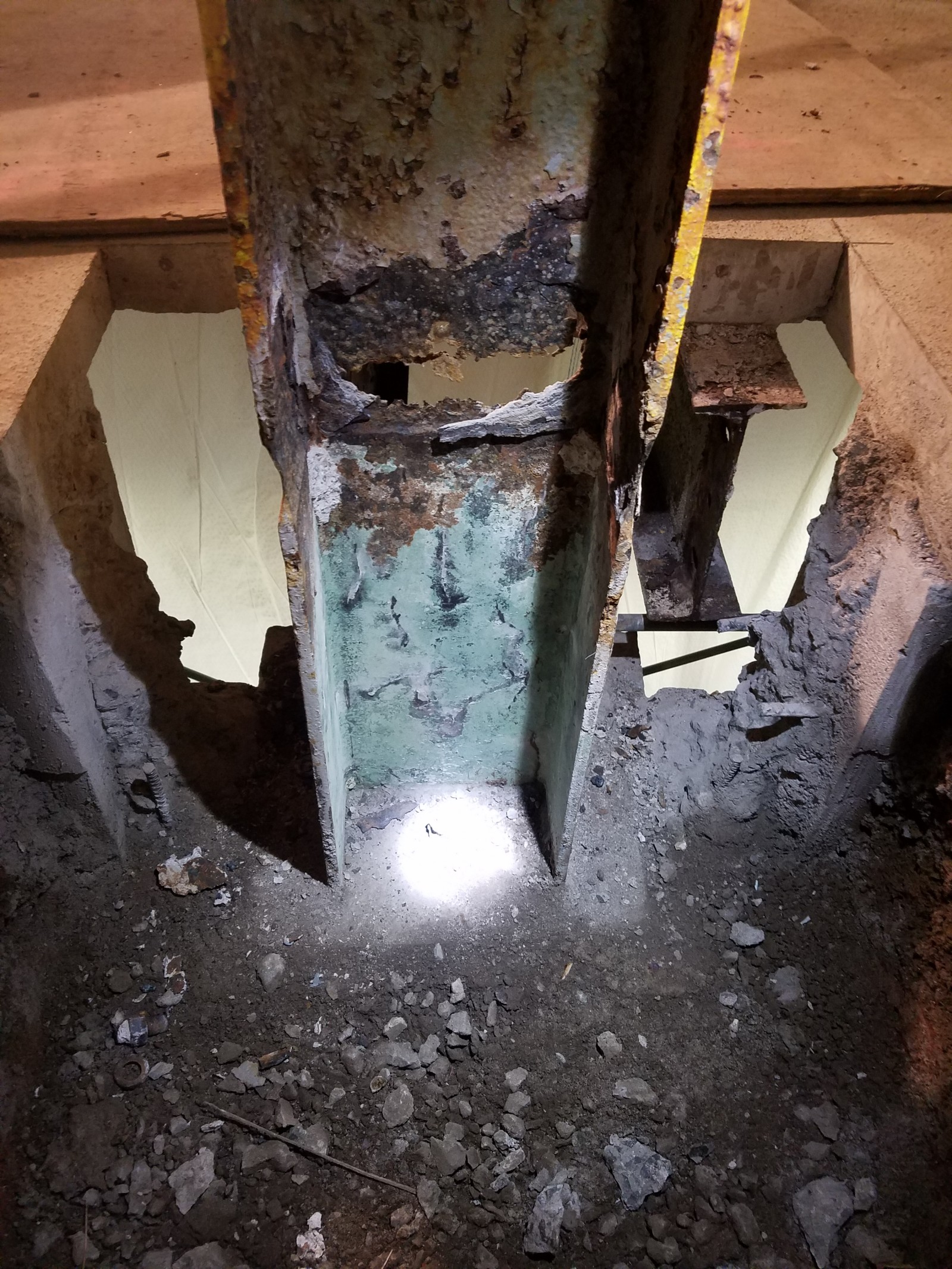 WJE began with a comprehensive assessment of the garage, including section loss measurements and a multiyear plumbness survey. During probing, we discovered steel columns with nearly 100 percent section loss.