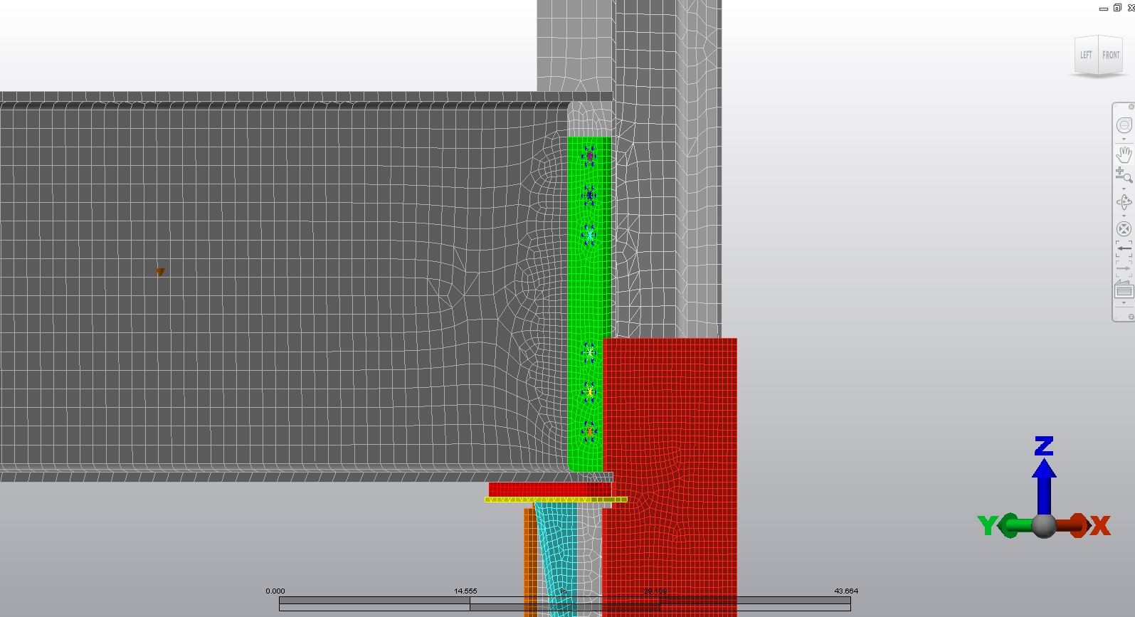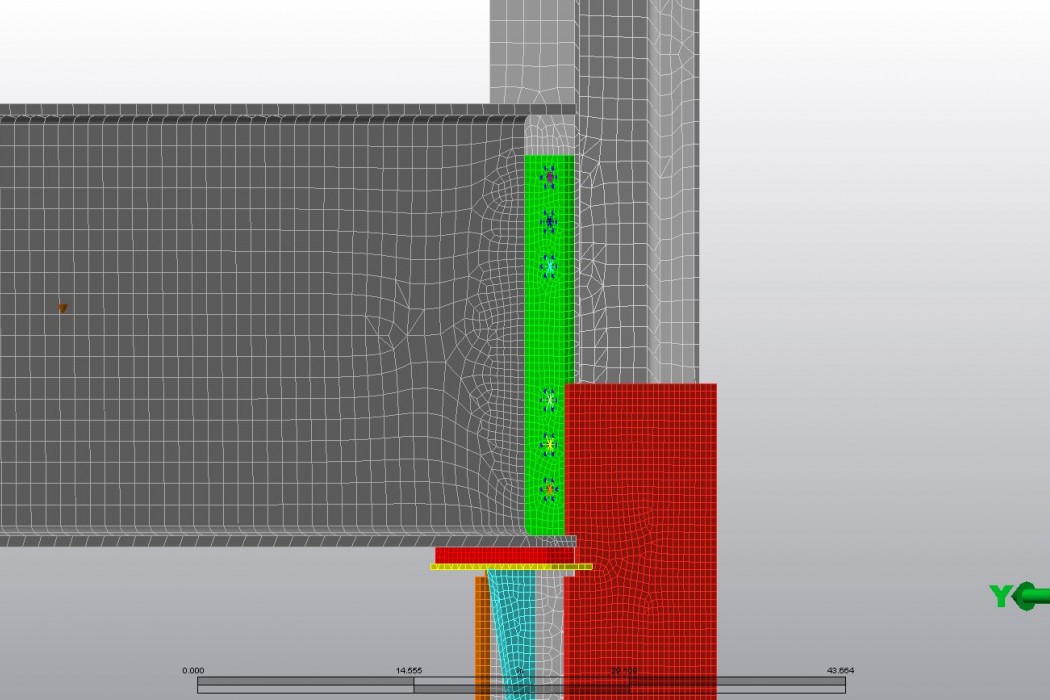 The structure was modeled in CSI SAP2000 and a detailed finite element analysis using Autodesk Simulation Mechanical. The finite element model of a typical moment connection served to locate points of high stress in the connection, particularly at the bolts and welds. In combination with the finite element model, the SAP model provided a better understanding of the behavior of the gravity system and the utilization ratios of the columns.