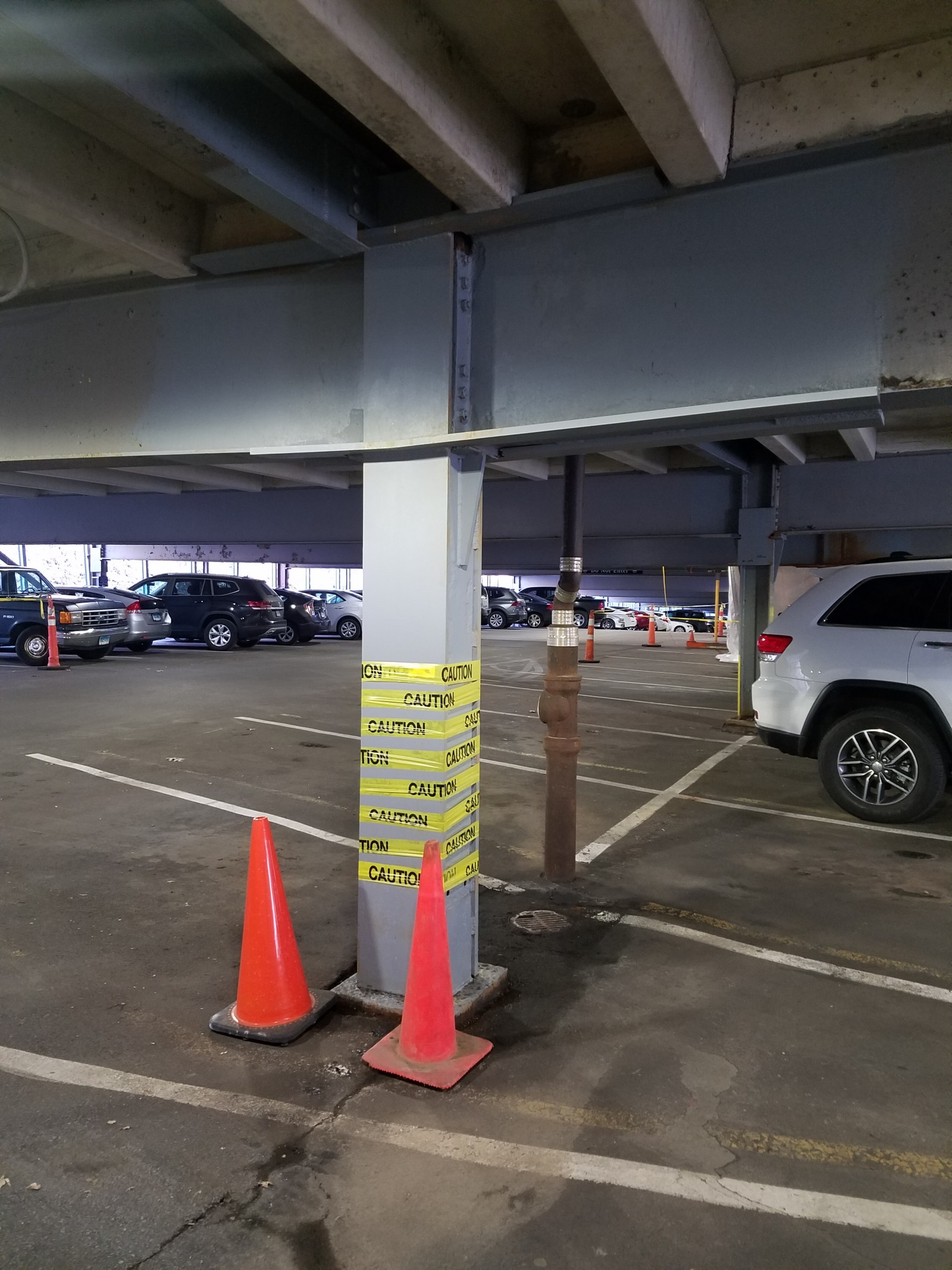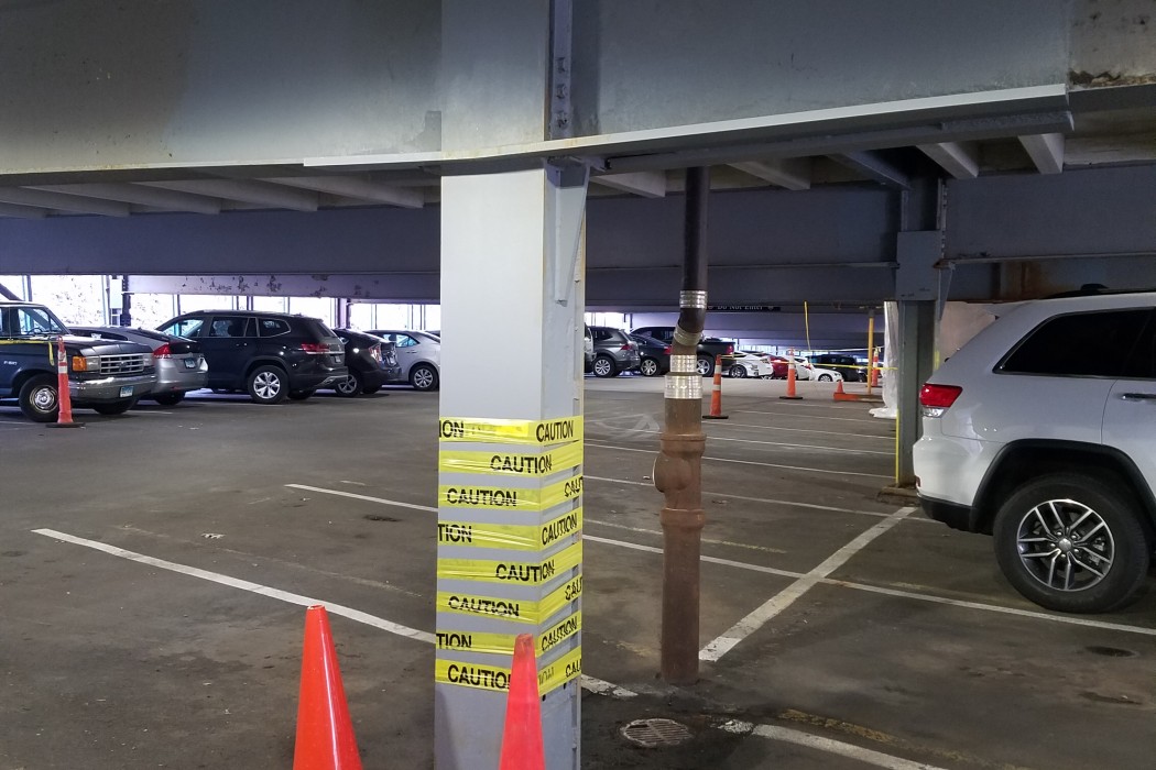 This parking garage had several chronic problems that could not be solved by several previous engineering firms engaged by the Owner throughout the life of the structure. The garage was leaning several inches. The columns’ webs were buckling where pinched by the girder moment connections, and long-term water infiltration and exposure to deicing salts caused severe corrosion of the steel frame. The Owner thought the garage needed to be torn down, but engaged WJE to determine a way to extend the life of the garage and maintain vital parking capacity.