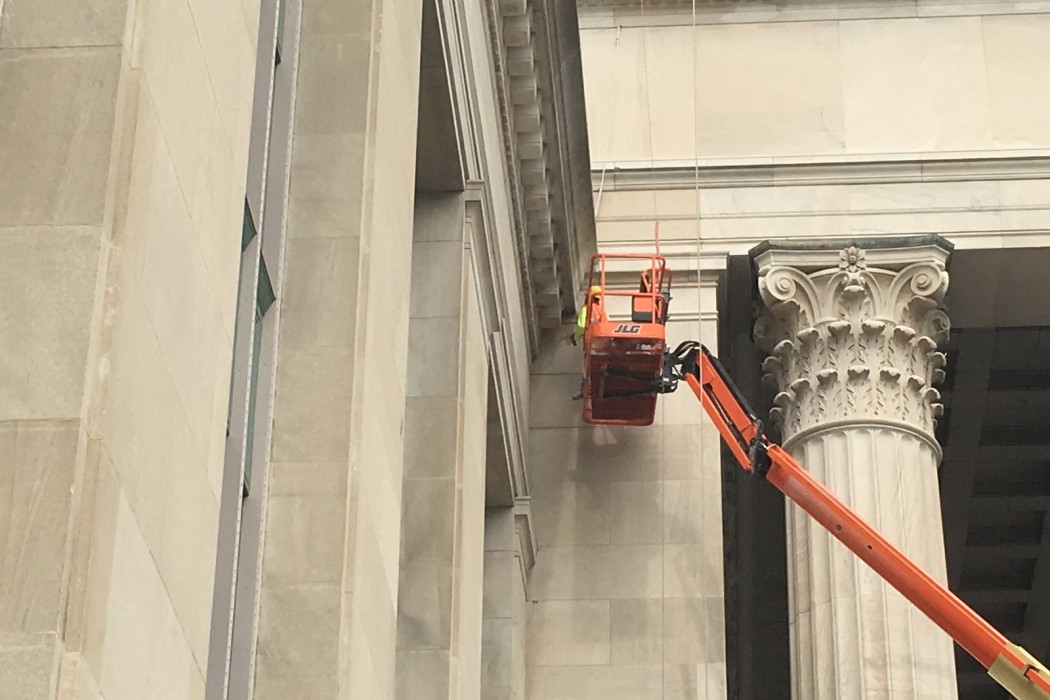 The WJE team prepared construction drawings and specifications for comprehensive restoration of the facade, including limestone repair, restoration, and cleaning; brick masonry repairs; restoration of cast iron mullions and steel-framed windows at the curtain walls; and restoration of selected bronze doors. Window frame and sash components were dismantled and taken off-site for hazardous material abatement, repair, recoating, reglazing, and application of blast film under controlled conditions. During the construction period, WJE’s services included full-time site observation throughout critical phases of the project and utilized tablet-based digital data collection and punch list management tools.